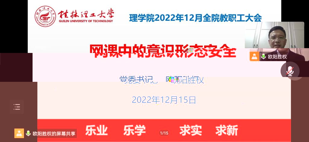 2022年12月15日,理學院意識形态領導小組辦公室組成督查小組,對全院各部門貫徹落實中央有關意識形态的決策部署及指示精神的情況,及執行本院内部意識形态工作制度情況開展了線上檢查。